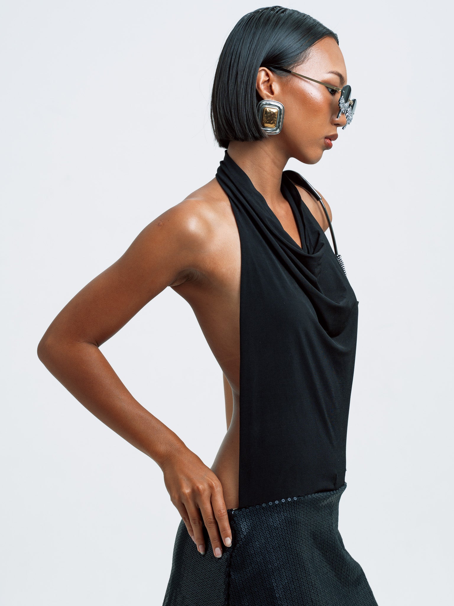 A bold reinterpretation of the classic mini, this jet-black dress features a slinky halter neckline with a dramatic draped cowl front and daringly low-cut sides. The open back and body-skimming silhouette make it a standout piece for after-dark energy.